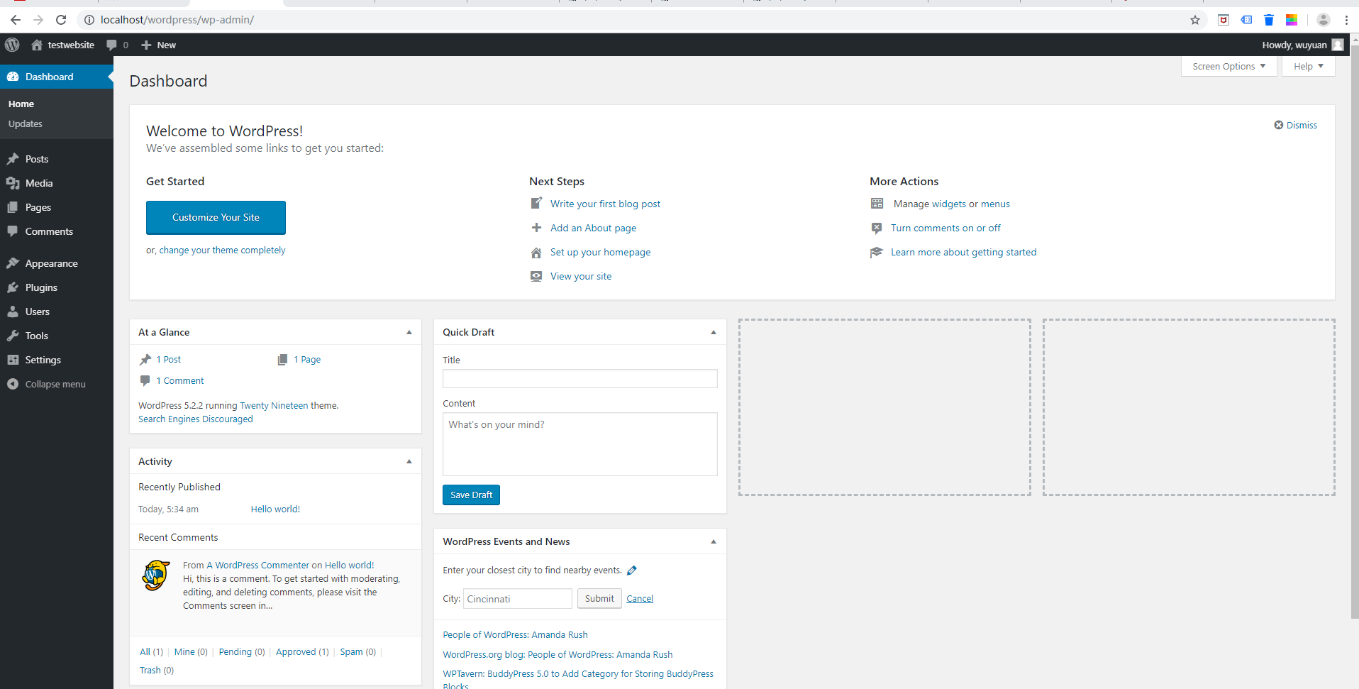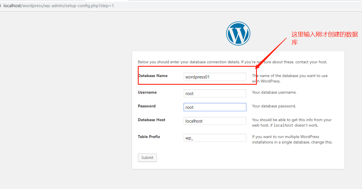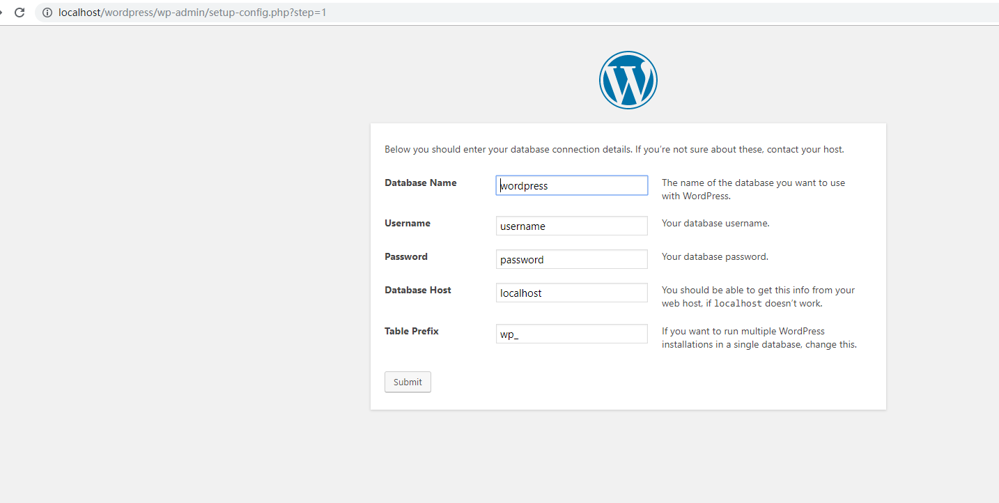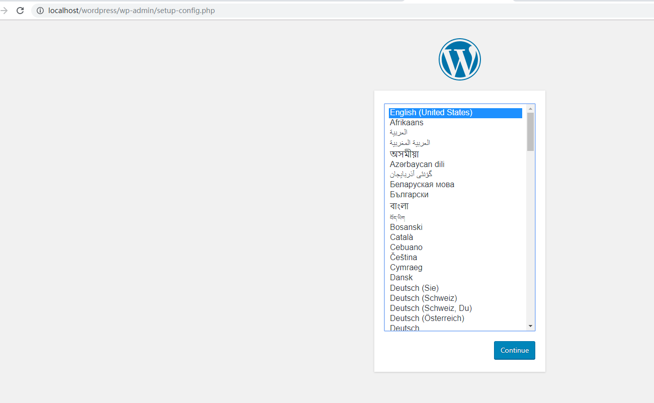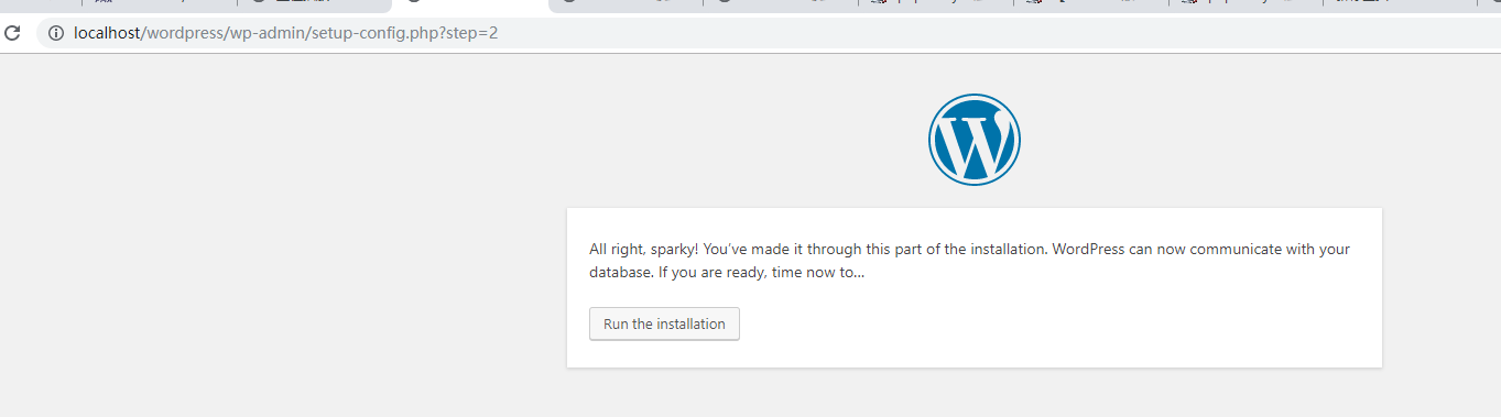 5.1 访问wordpress文件里面的index.php,在浏览器输入localhost/wordpress/index.php即可,得到如下页面