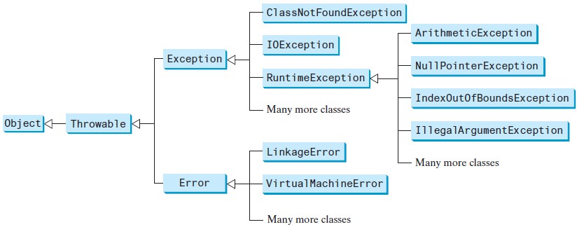 - 错误:错误不是异常,而是脱离程序员控制的问题。错误在代码中通常被忽略。如果发生,除了通知用户以及尽量稳妥地终止程序外,几乎什么也不能做。例如,当栈溢出时,一个错误就发生了,它们在编译也检查不到的。