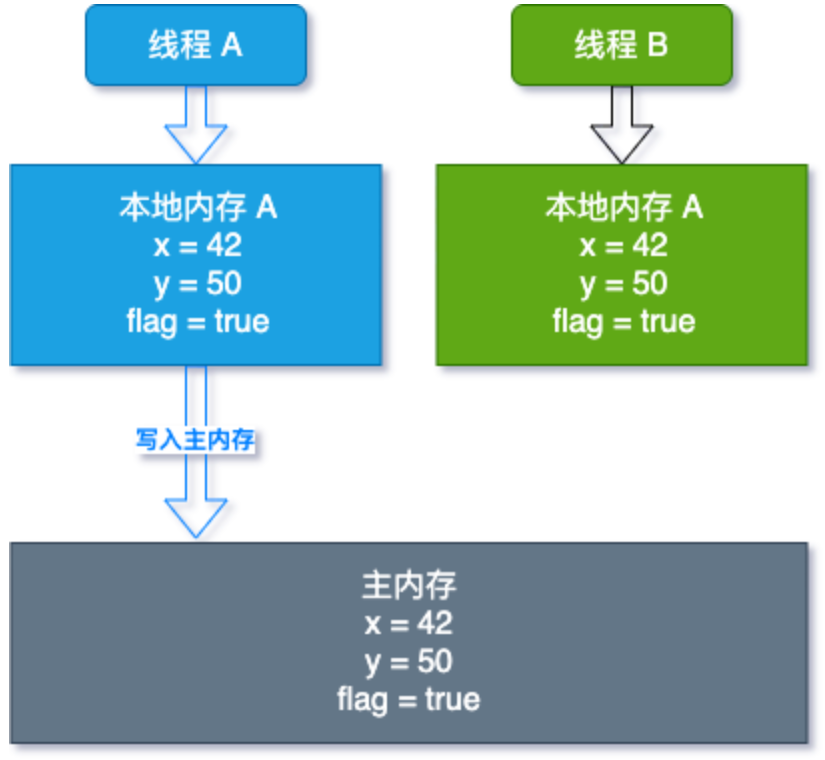 - 根据JMM,当线程A执行writer方法时,线程A将本地内存更改的变量写回到主内存中: