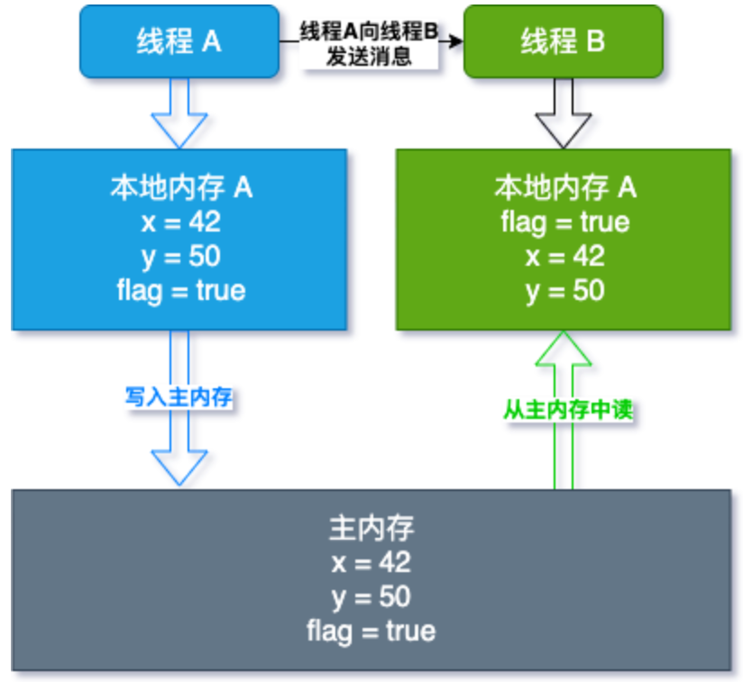 - 线程A写一个volatile变量,随后线程B读这个volatile变量,这个过程实质上是线程A通过主内存向线程B发送消息。