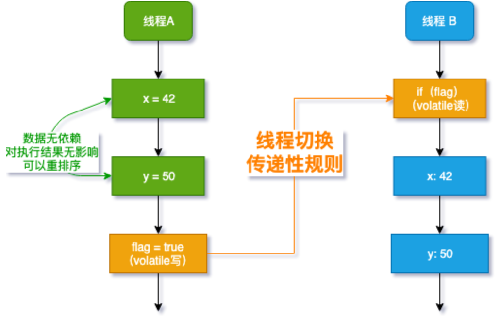 根据规则3传递性规则,x = 42Happens-before读变量if(flag)。