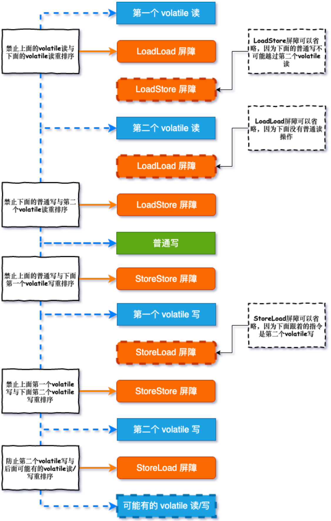 - 显然有很多屏障是重复多余的,右侧虚线框指向的屏障是可以被「优化」删除掉的屏障