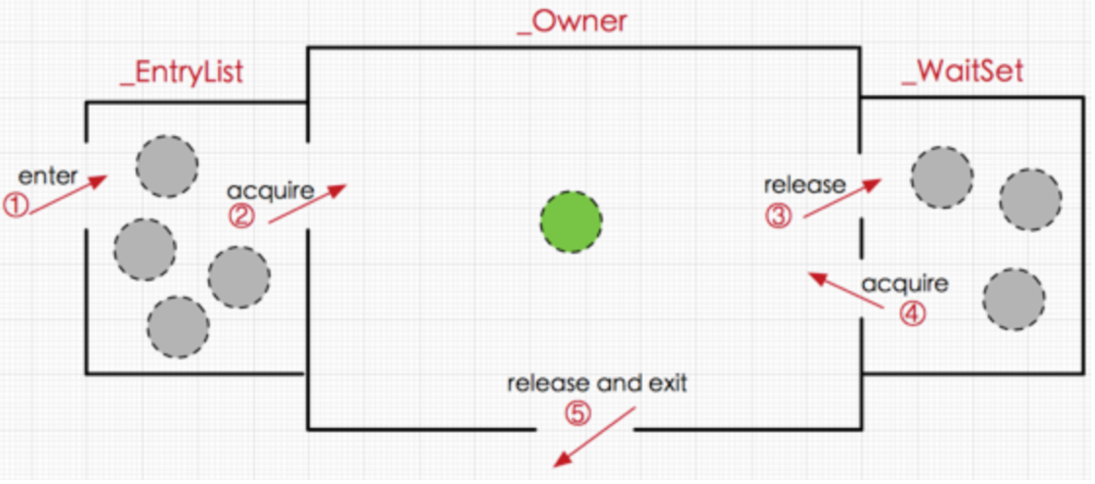 当多个线程同时访问一段同步代码时,首先会进入_EntryList集合,当线程获取到对象的monitor后进入_Owner区域,并把monitor中的owner变量设置为当前线程同时monitor中的计数器count加1。