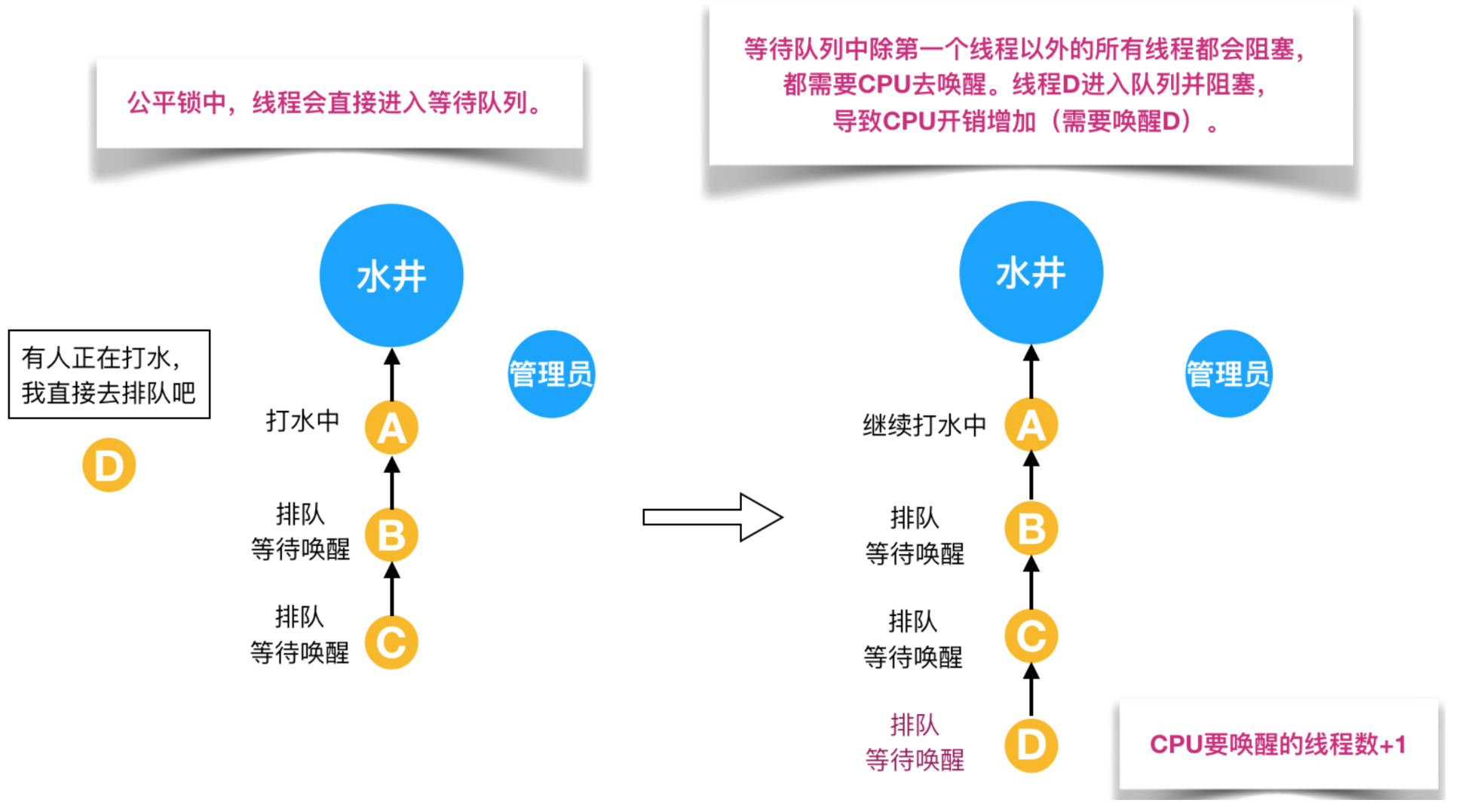- 缺点是整体吞吐效率相对非公平锁要低,等待队列中,除第一个线程以外的所有线程都会阻塞,CPU唤醒阻塞线程的开销比非公平锁大。