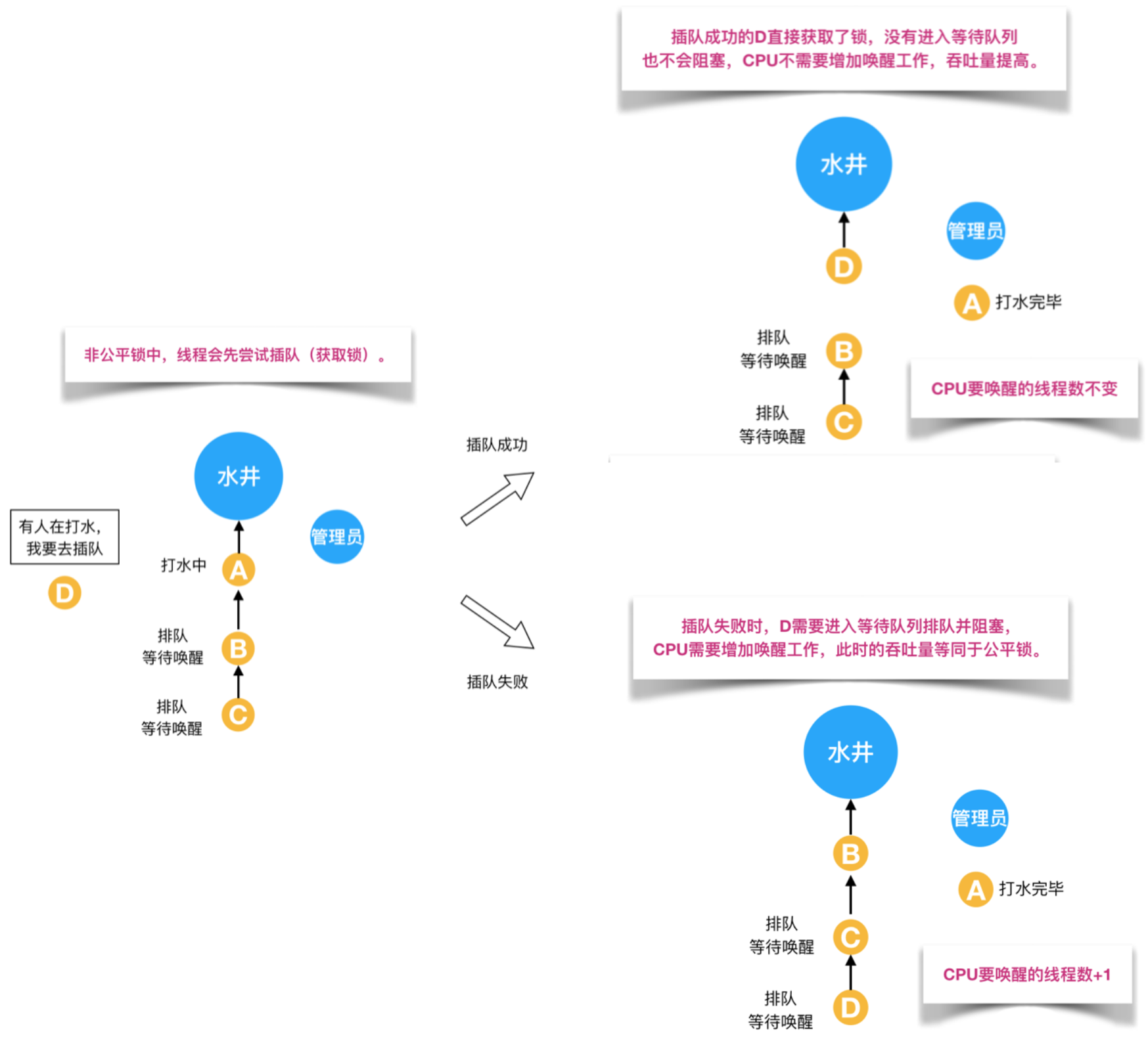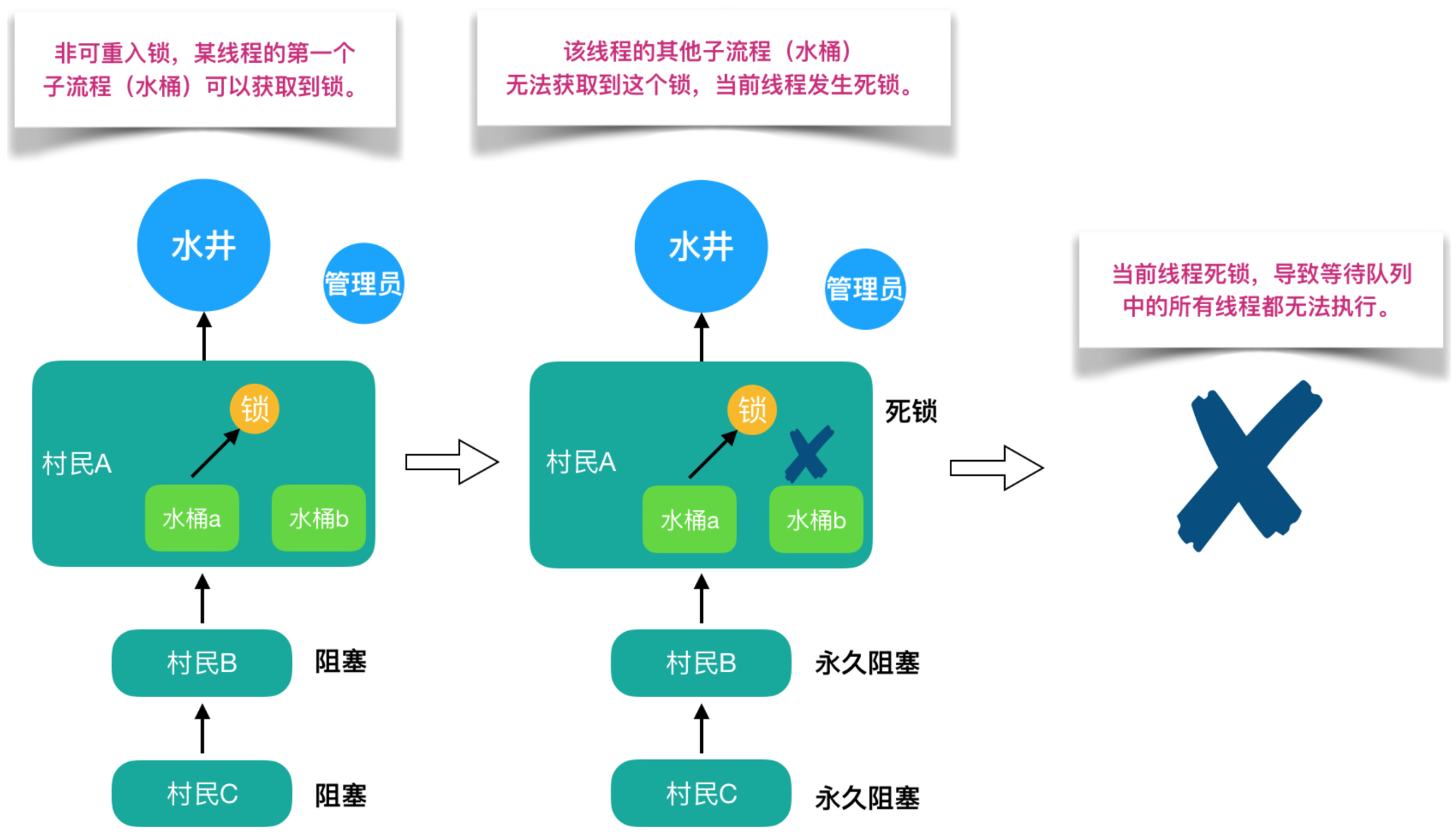 但如果是非可重入锁的话,此时管理员只允许锁和同一个人的一个水桶绑定。第一个水桶和锁绑定打完水之后并不会释放锁(需要等第二桶水打完才能释放锁),导致第二个水桶不能和锁绑定也无法打水。当前线程出现死锁,整个等待队列中的所有线程都无法被唤醒:
