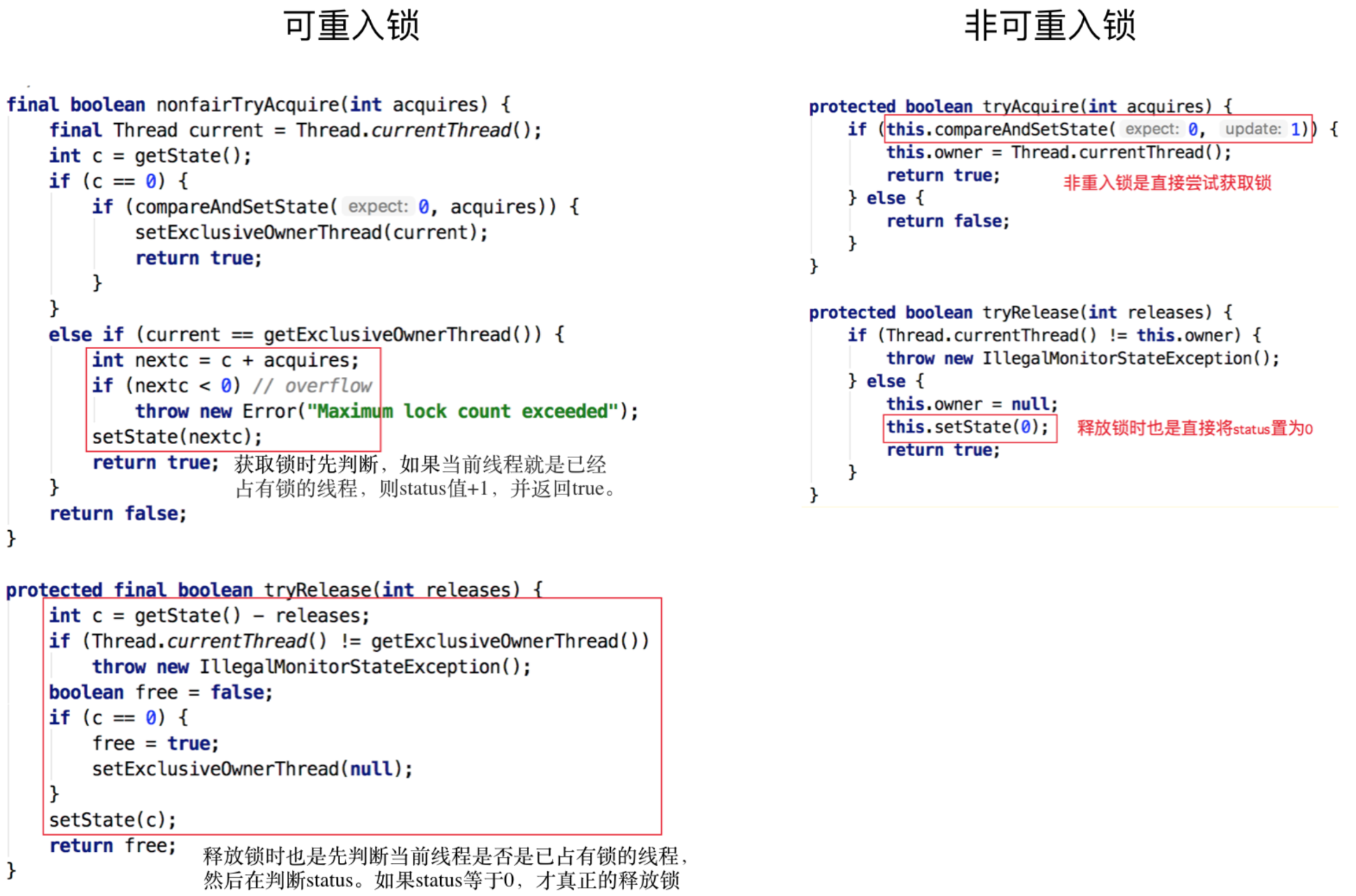 status-1 == 0,则表示当前线程所有重复获取锁的操作都已经执行完毕,然后该线程才会真正释放锁。 - 而非可重入锁则是在确定当前线程是持有锁的线程之后,直接将status置为0,将锁释放。