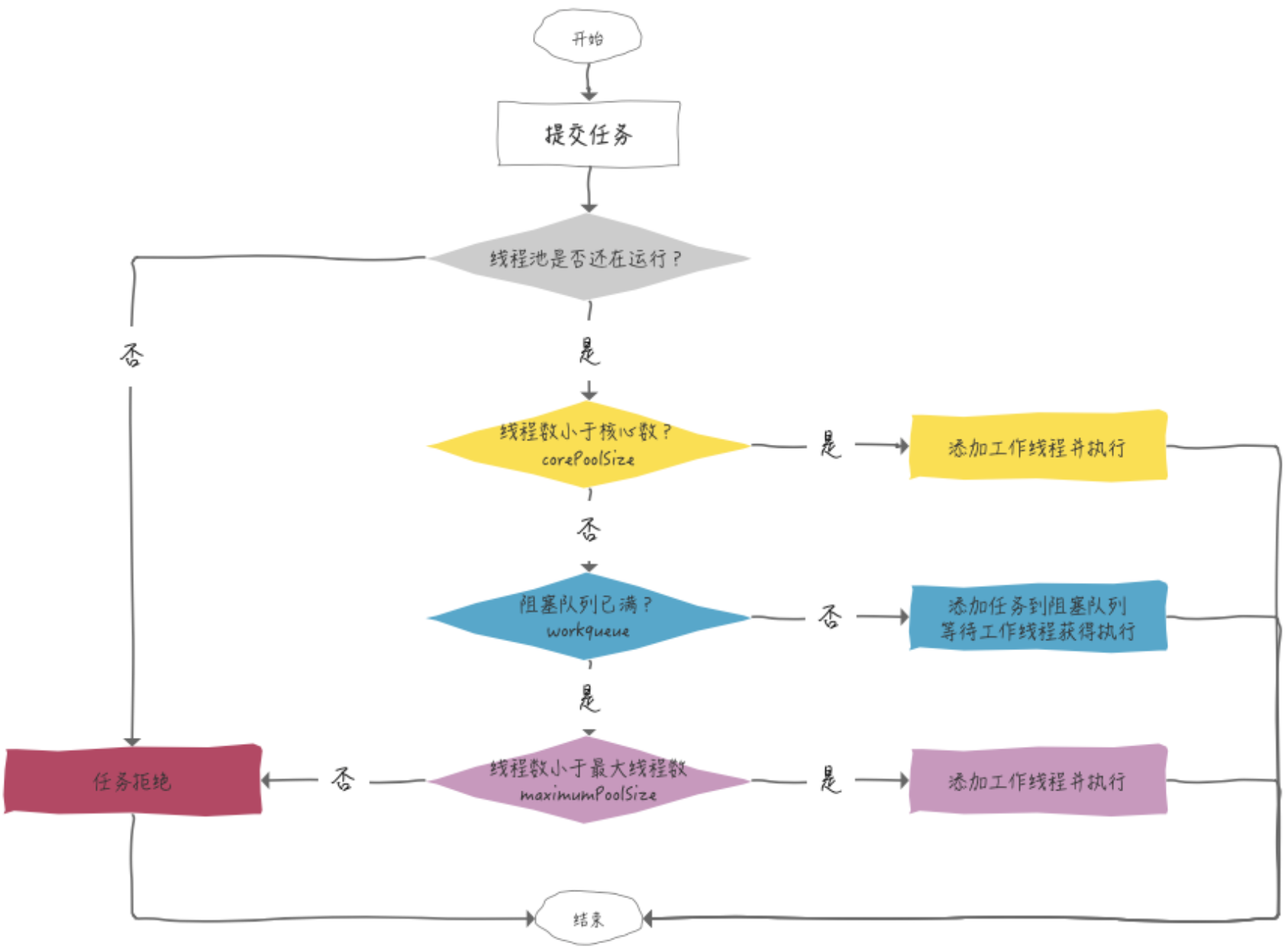 corePoolSize时,新建线程执行任务; - 情形二:当正在运行的线程数\(\geq\)