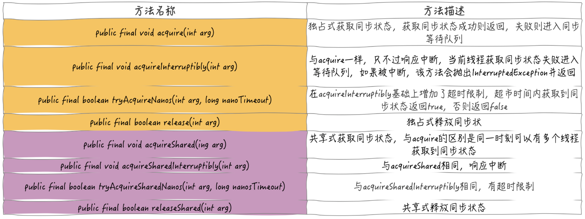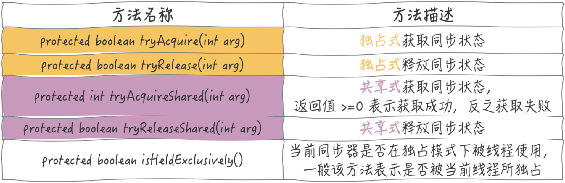 | protected boolean tryAcquire(int arg) | 独占方式。arg为获取锁的次数,尝试获取资源,成功则返回True。 |