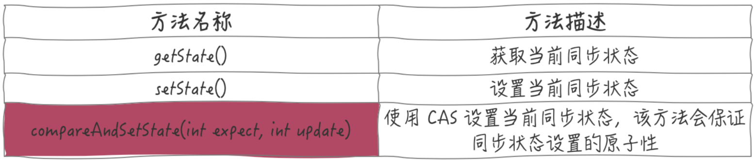 同步状态就是用volatile修饰的state——用于展示当前临界资源的获锁情况,所以在重写上面表格中的几个方法时,还要通过同步器提供的下面三个方法(AQS提供的)来获取或修改同步状态: