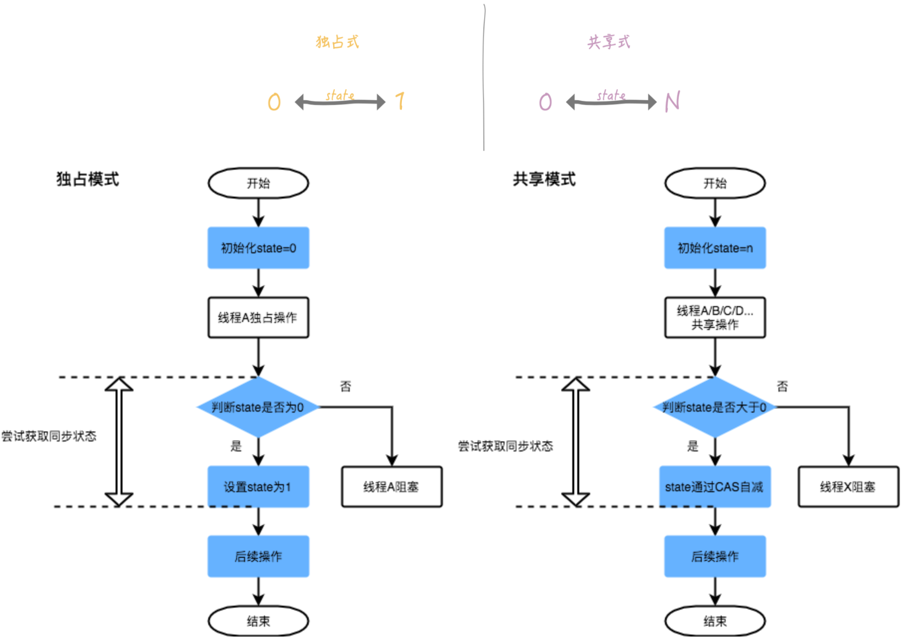 CAS完成对State值的修改,来实现多线程的独占模式(0-1)和共享模式(0-N)。