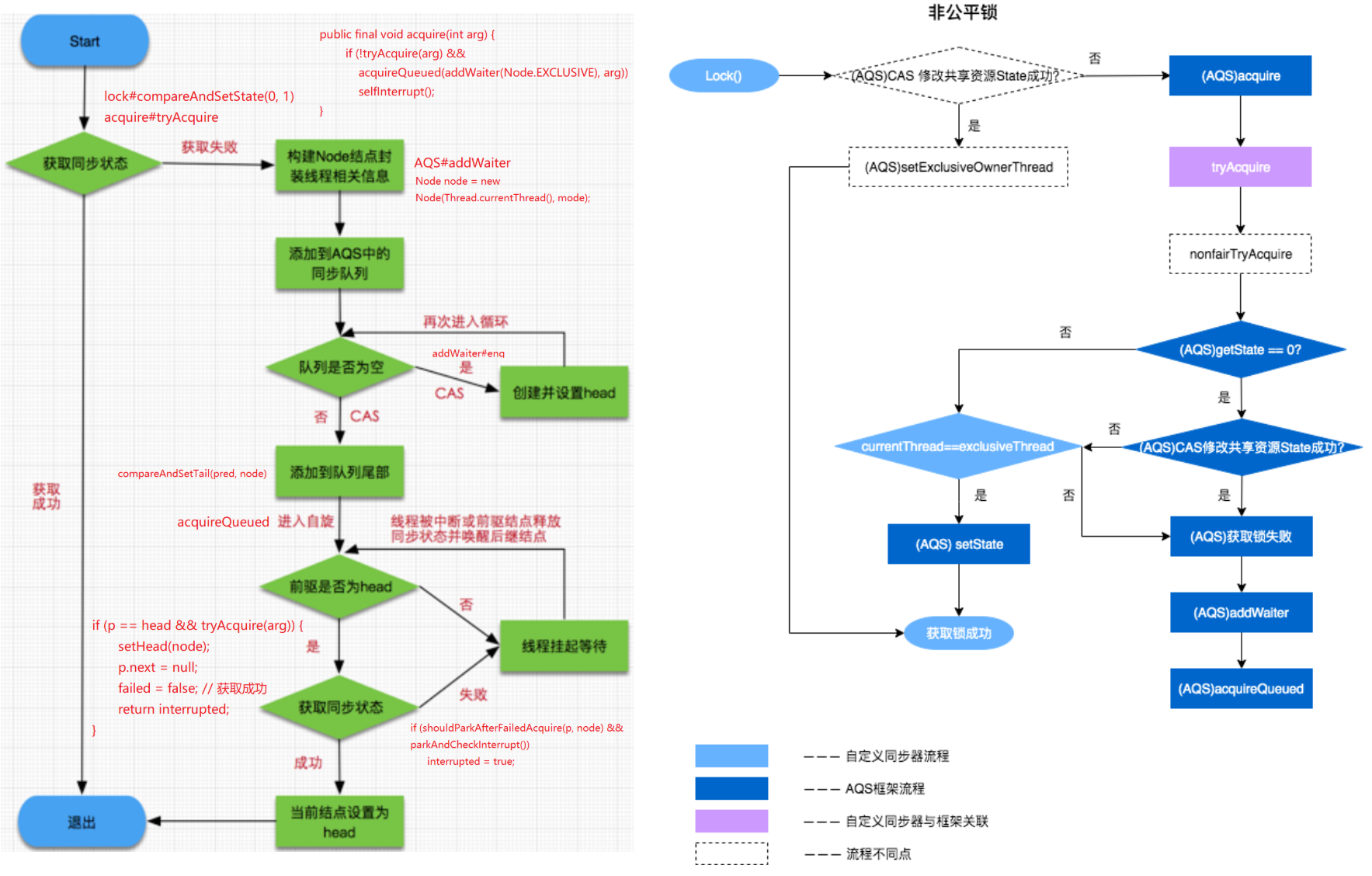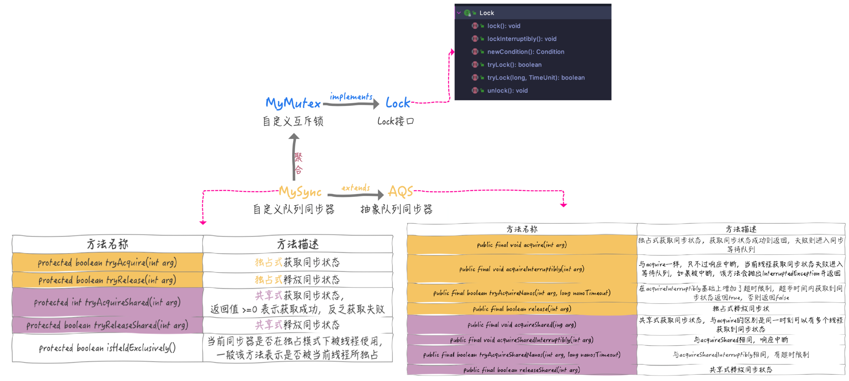 一般来说,自定义同步器要么是独占方式,要么是共享方式,它们也只需实现tryAcquire-tryRelease、tryAcquireShared-tryReleaseShared中的一种即可。AQS也支持自定义同步器同时,实现独占和共享两种方式,如ReentrantReadWriteLock。ReentrantLock是独占锁,所以实现了tryAcquire-tryRelease。