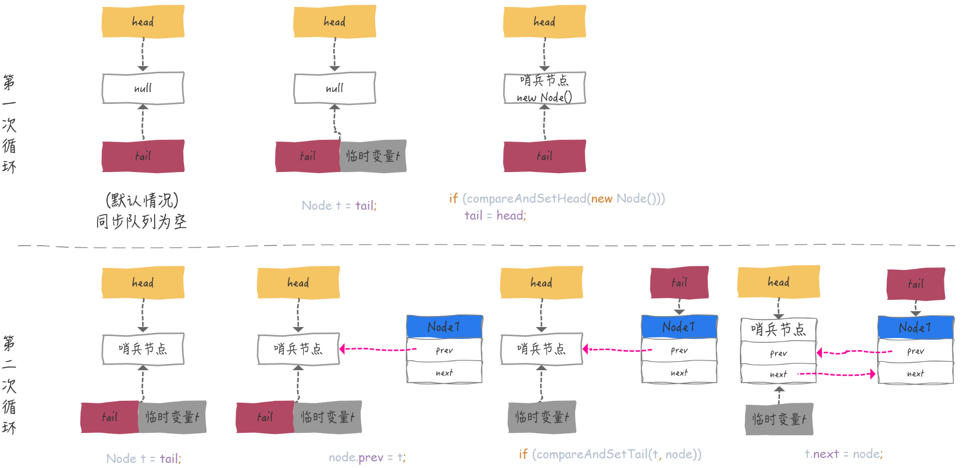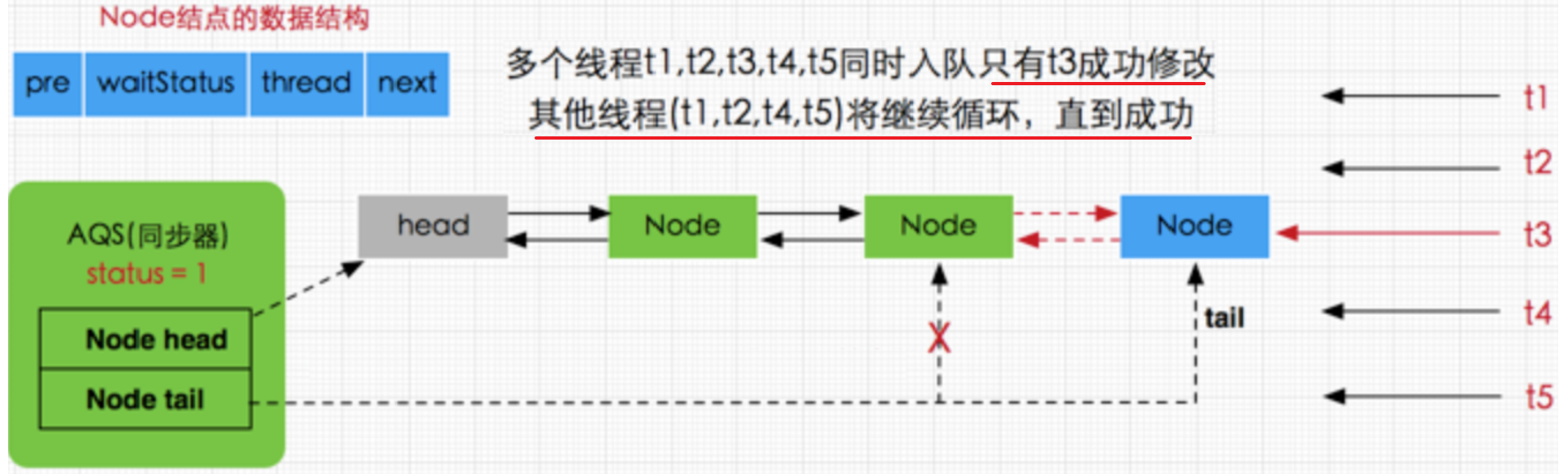 综上所述,如果是从前往后找,由于极端情况下入队的非原子操作和CANCELLED节点产生过程中断开Next指针的操作,可能会导致无法遍历所有的节点。