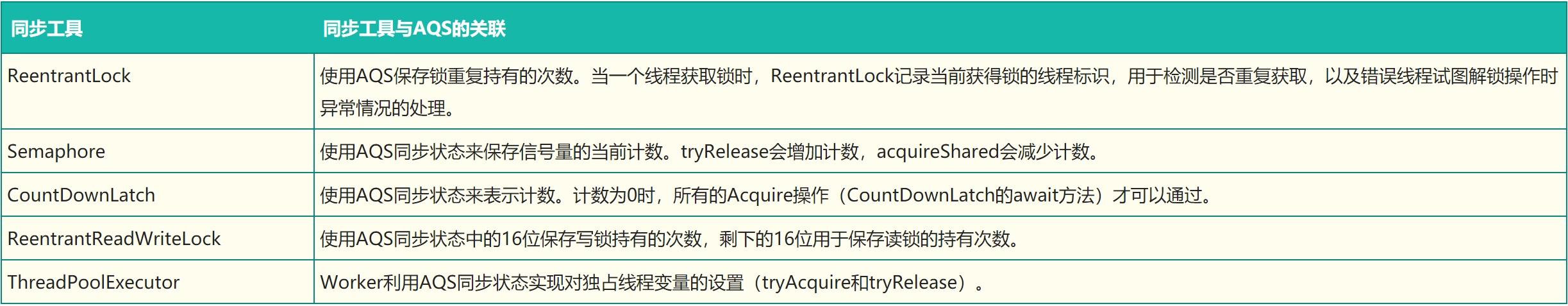 队列同步器(AbstractQueuedSynchronizer),简称同步器或AQS。它为实现锁提供了一个框架,内部维护了一个先进先出的队列,以及state状态变量!ReentrantLock、ReentrantReadWriteLock、Semaphore(信号量)、CountDownLatch、公平锁、非公平锁、ThreadPoolExecutor等都和AQS有关!