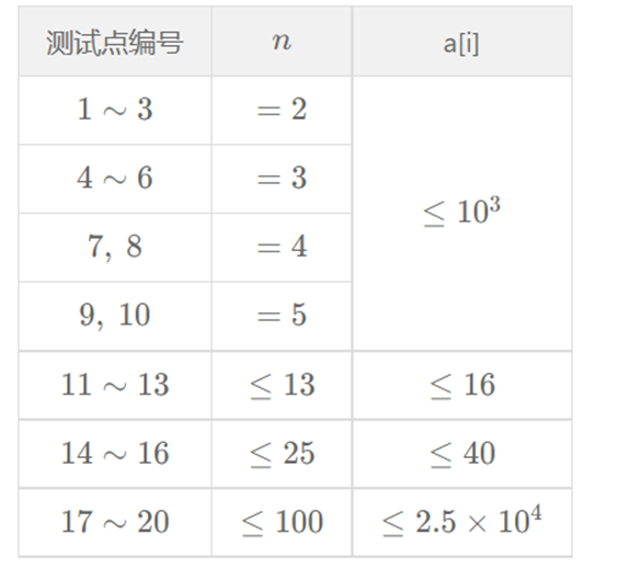 对于全部数据,满足1≤T≤20, n,a[i]≥1。