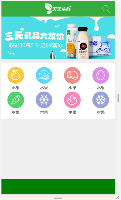 1 <!doctype html> 2 <html lang="en"> 3 <head> 4 <meta charset="UTF-8"> 5 <meta name="viewport" 6 content="width=device-width, user-scalable=no, initial-scale=1.0, maximum-scale=1.0, minimum-scale=1.0"> 7 <meta http-equiv="X-UA-Compatible" content="ie=edge"> 8 <title>天天生鲜-首页-手机版</title> 9 10 <link rel="stylesheet" type="text/css" href="css/reset.css" > 11 <link rel="stylesheet" type="text/css" href="css/main.css"> 12 </head> 13 <body> 14 15 <div class="main_wrap"> 16 <div class="header clearfix"> 17 <a href="" class="logo"><img src="images/logo.png" alt="log"></a> 18 <a href="" class="search"></a> 19 </div> 20 21 <div class="center_wrap"> 22 <div class="slide"> 23 <img src="images/slide.jpg" alt="幻灯片"> 24 </div> 25 26 <ul class="menu"> 27 <li> 28 <a href=""></a> 29 <h2>水果</h2> 30 </li> 31 <li> 32 <a href=""></a> 33 <h2>水果</h2> 34 </li> 35 <li> 36 <a href=""></a> 37 <h2>水果</h2> 38 </li> 39 <li> 40 <a href=""></a> 41 <h2>水果</h2> 42 </li> 43 <li> 44 <a href=""></a> 45 <h2>水果</h2> 46 </li> 47 <li> 48 <a href=""></a> 49 <h2>水果</h2> 50 </li> 51 <li> 52 <a href=""></a> 53 <h2>水果</h2> 54 </li> 55 <li> 56 <a href=""></a> 57 <h2>水果</h2> 58 </li> 59 </ul> 60 </div> 61 62 <div class="footer"></div> 63 64 </div> 65 66 </body> 67 </html>