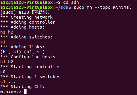 最小拓扑,1 台交换机下挂 2 台主机 $ sudo mn --topo minimal