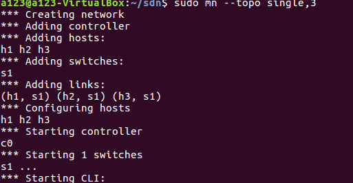 简单拓扑,1 台交换机下挂 n 台主机,此处 n=3,n=2 即为最小拓扑 $ sudo mn --topo single,3