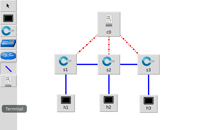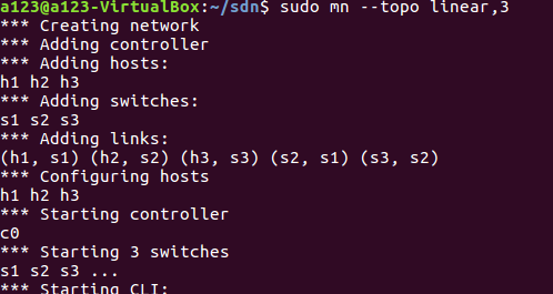 线性拓扑,交换机连成一线,每台交换机下挂 1 台主机,此处有 3 台交换机 3 台主机 $ sudo mn --topo linear,3