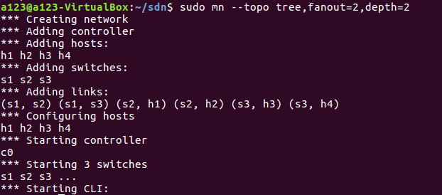 树形拓扑,基于深度 depth 和扇出 fanout,此处均为 2 $ sudo mn --topo tree, fanout=2,depth=2