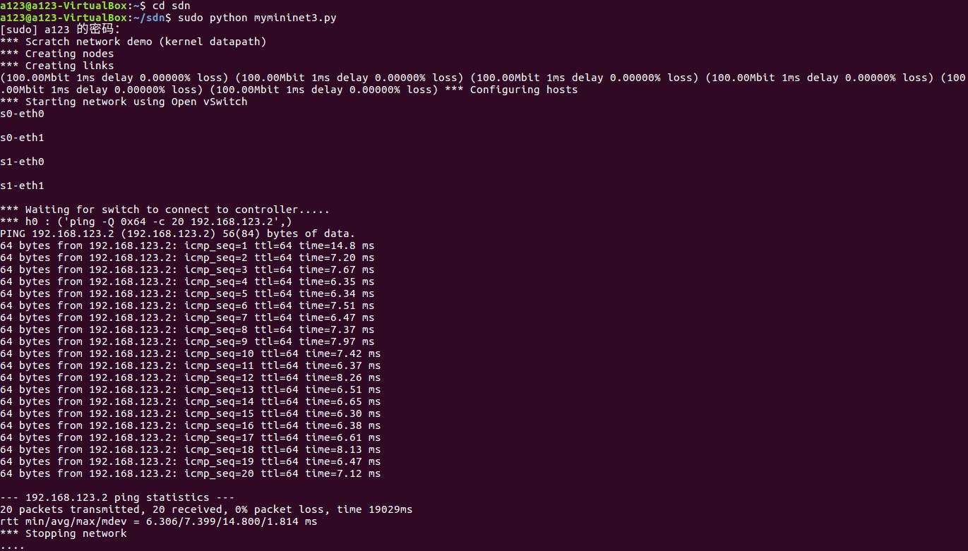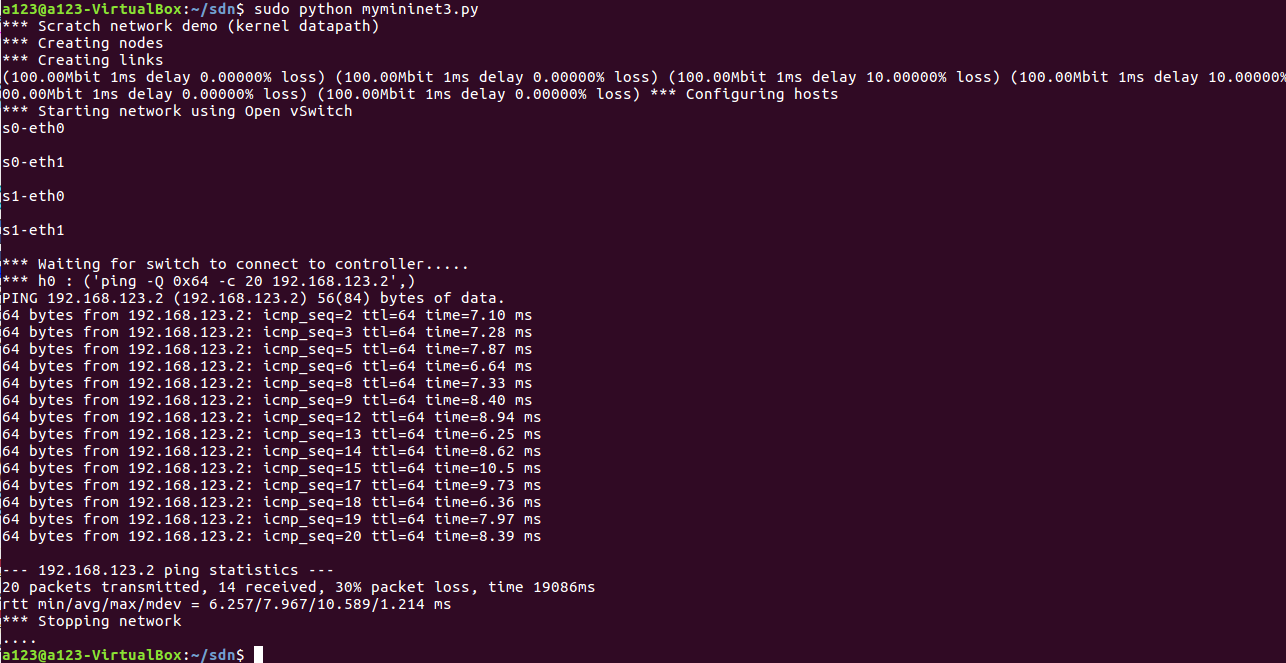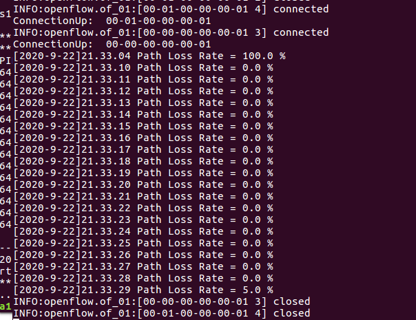 - h0 向 h1 发送数据包,由于在 Mininet 脚本中设置了连接损耗率,在传输过程中会丢失一些包,本次实验的目的是展示如何通过控制器计算路径损耗速率(h0-s0-s1-h1)。这里假设控制器预先知道网拓扑。控制器将向 s0 和 s1 发送flow_stats_request,当控制器接收到来自 s0 的 response 时,将特定流的数据包数保存在 input_pkts 中,当控制器接收到来自 s1 的 response 时,将接收到特定