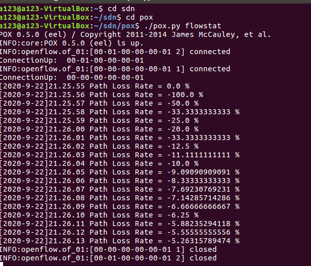 流的数据包数保存在 output_pkts 中,差值就是丢失的数据包数量。基于上述拓扑,编写 Mininet 脚本,设置特定的交换机间的路径损耗速率,然后编写 POX 控制器脚本,实现对路径的损耗率的测量。