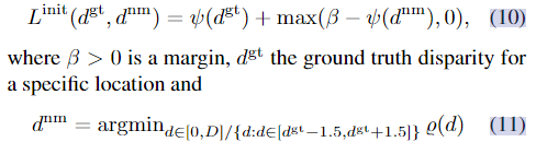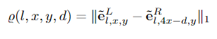 为了清晰起见,我们去掉了l、x、y下标。为了在多个分辨率下计算它们,我们将地面实况视差图最大化,以将它们向下采样到所需的分辨率。我们的目标是将特征E训练为使得匹配成本ψ在地面实况视差处最小,而在其他地方更大。为了实现这一点,我们施加了`1对比损失[18]