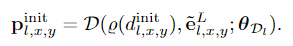 这些特征基于参考图像的嵌入向量eL l,x,y和最佳匹配视差的代价%。我们使用感知器D,具有可学习的权重θD,该感知器通过1×1卷积和泄漏的ReLU来实现。瓦片特征描述符的输入包括匹配成本%(·),这允许网络获得匹配的置信度。