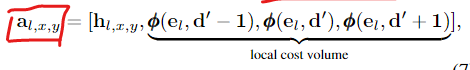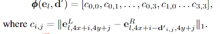 对于面片坐标i,j∈{0,··,3}。然后使用局部视差来使用沿着扫描线的线性插值将特征eR l从右(次)图像扭曲到左(参考)图像。这导致扭曲的特征表示eR′l,如果局部视差图d′是准确的,则其应该与左(参考)图像eL的相应特征非常相似。比较参考(x,y)瓦片和翘曲的次瓦片的特征,我们将成本向量φφ(e,d′)∈R16定义为:
