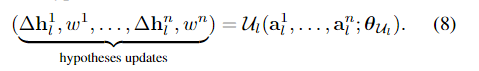 对于位置(x,y)和分辨率l,CNN模块Ulthen预测n个瓦片假设映射中的每一个的更新,以及表示瓦片假设的置信度的wi∈R: