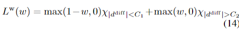 其中,χ是一个指标函数,当条件满足时,它的值为1,否则为0。为了监督置信度w,我们施加损失,如果预测的假设离基本事实比阈值C1更近,则该损失增加置信度,如果预测假设离基本真相比阈值C2更远,则降低置信度。