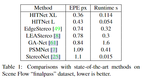 对于SceneFlow上的EPE计算,我们采用与PSMNet[7]相同的方法,该方法将所有实际视差大于192的像素排除在评估之外。除非另有说明,否则我们使用具有5个级别的HITNet,即M=4。