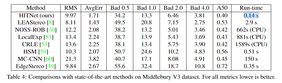HITNet在ETH3D网站上发布的双视立体声的所有指标中排名第1,在Middlebury-v3上所有端到端学习方法中的大多数指标中排名第1,在发布的速度超过100毫秒的流行KITTI 2012和2015基准中排名第1。