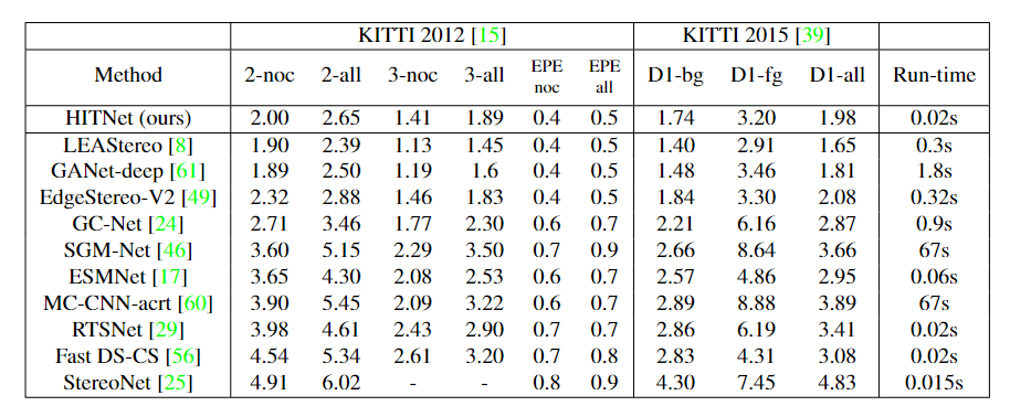 在撰写本文时,在发布的速度超过100ms的方法中,HITNet在Kitti 2012和2015基准测试中排名第一。