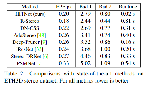 HITNet在网站公布的所有指标中排名第一至第四。特别是,我们的方法在以下指标上对1ND进行了排名:Bad 0.5,Bad 4,平均误差,RMS误差,50%分位数,90%分位数:这表明HITNet对所选的特定度量具有弹性,而竞争方法在选择不同的度量时表现出显著的差异。