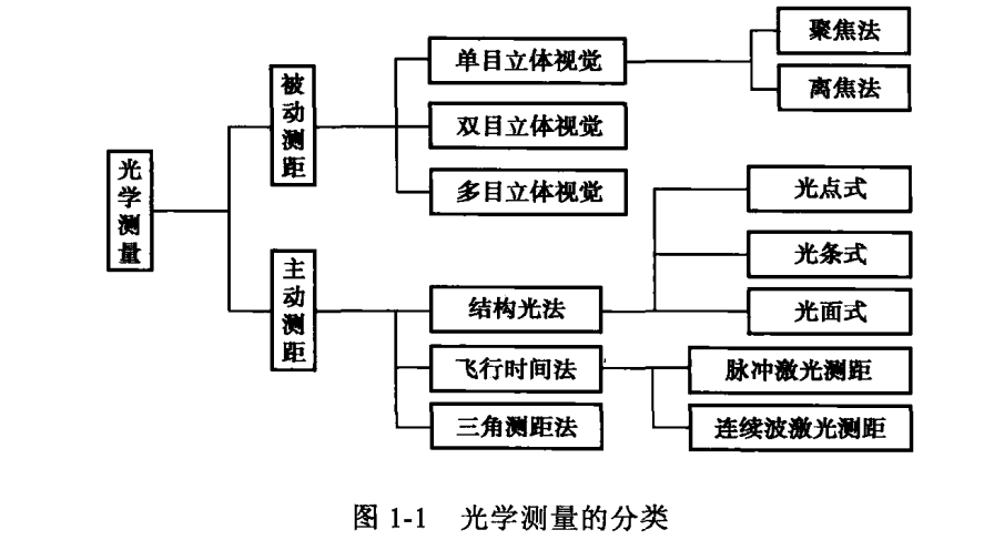 代表性方法:1)结构光法、2)飞行时间法(ToF)、3)三角测距法。