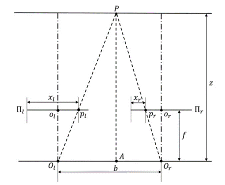 P是空间中的一个点,Ol和Or是左右相机的光心,pl和pr是P点在左右相机的成像平面Πl和Πr上的像点,xl和xr是pl和pr的x坐标,ol和or是左右相机的光轴和成像平面的交点,A是P作垂线与 OlOr 的交点,f 是相机焦距,b是基线,z是P点的深度。