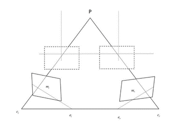 为了更好地利用对极几何约束,使匹配搜索在两幅图像的同扫描线方向上进行,以简化计算,可以采用所谓的图像校正技术,即一个重投影的过程,利用它来保证对极线始终与图像扫描线平行,且对应匹配点的对极线共线。图像校正的步骤是:首先由基础矩阵求得投影矩阵,再由投影矩阵求得当前相机的光学中心,即可建立一个与光学中心连线平行的平面作为重投影平面,最后将像平面上的所有像点都重新投影到重投影平面上。进行对极几何估计并对图像对进行校准之后,就可以在对极线上进行搜索,以确定最佳匹配点。这时对应点的坐标只在x轴方向上有差别,其差值称为视差。它是由于相机位置不同使同一点在图像中的投影点的位置不同而引起的,并且点的深度值与其视差成反比。对极几何的引入,不仅大幅度降低了匹配的计算量,而且还为图像间的稠密匹配提供了可能。