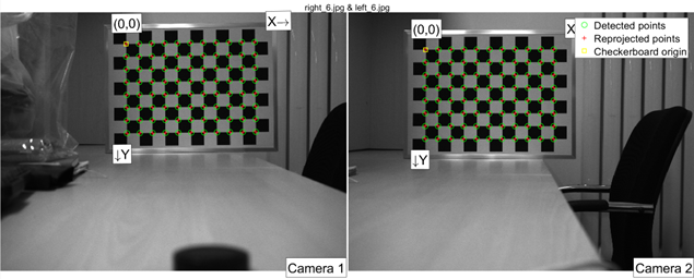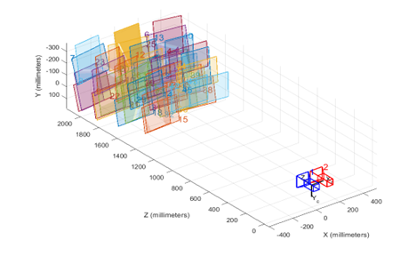 采用棋盘格作为标志物求解每个相机视图的旋转和平移参数,然后再将这些参数带入上述公式求解旋转和平移矩阵。对得到的多组R和T矩阵求中值去接近真实结果。下图是利用MATLAB标定工具箱的标定结果。