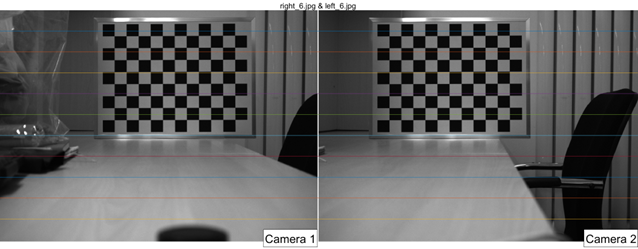 当相机的像校正平面是完全行对准时,计算视差是最方便的。但在实际中,准确共面和行对准的成像平面并不存在,因此需要对左右图分别进行重投影,使其在数学上落在同一平面上,完成这一操作的过程称为立体校正。立体矫正使左右相机的像平面各旋转一个角度,最终像平面共面。经典的校正算法有Hartley算法和Bouguet算法。图2.5是立体校正的结果,图a为左右相机采集的原始图像,图b为经过立体校正之后的左右图像,在b图中左右图像中对应的所有棋盘格角点处于像素平面的同一行。