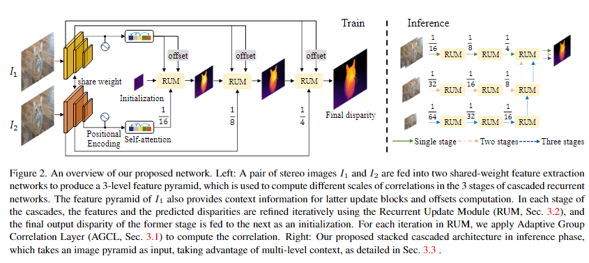 This is an overview of our proposed network. A pair of images are fed into two shared weight feature extractors to produce a three-level feature pyramid , which is used to compute different scales of correlations. In each stage of the cascades, the features and the predicted disparities are refined iteratively using the recurrent update module rum with an exponentially weighted multi-level loss as supervision.