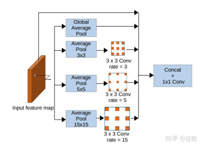 •创新点1(红框)-- 引入了空间金字塔池化模块(spatial pyramid pooling,SPP)。用SPP聚合多尺度的信息。