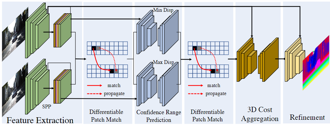 2.网络结构:一个可微的PatchMatch模块、剪枝减小视差搜索范围、一个图像引导的细化模块