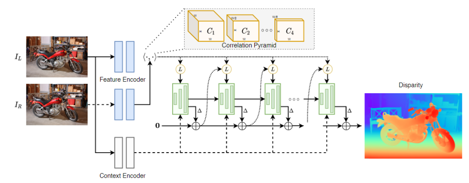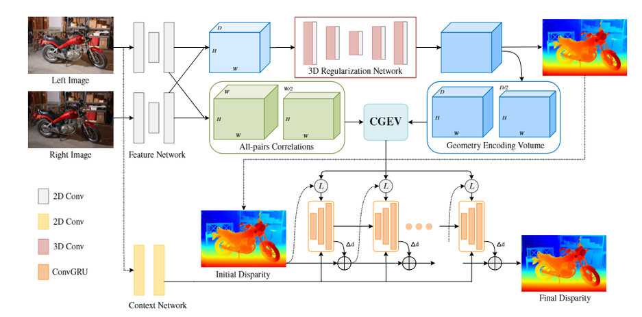 视差优化阶段,提出的IGEV Stereo构建了一个组合的几何编码代价空间,该代价空间融合几何和上下文信息以及局部匹配细节,对逐步迭代索更新视差图进行指导。