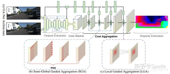 本文主要针对立体匹配中的代价聚合(从得到cost volume到softmax回归计算视差这一部分)进行优化,传统方法就是堆叠的3D卷积,3D卷积的参数量是很高的。而本文中提出了两种网络层,用更少的参数就可以达到相同的效果。一种是对半全局匹配的修改,称为半全局聚合层(semi-global aggregation layer),另一种是局部指导的聚合层(local guided aggregation layer),也是借鉴传统立体匹配方法的代价滤波策略(后面会稍微具体地解释)。前者聚合全图多个方向的代价,使得在遮挡区域、低纹理区域也有较好的估计;后者聚合局部代价来处理那些较细的结构和物体边缘。