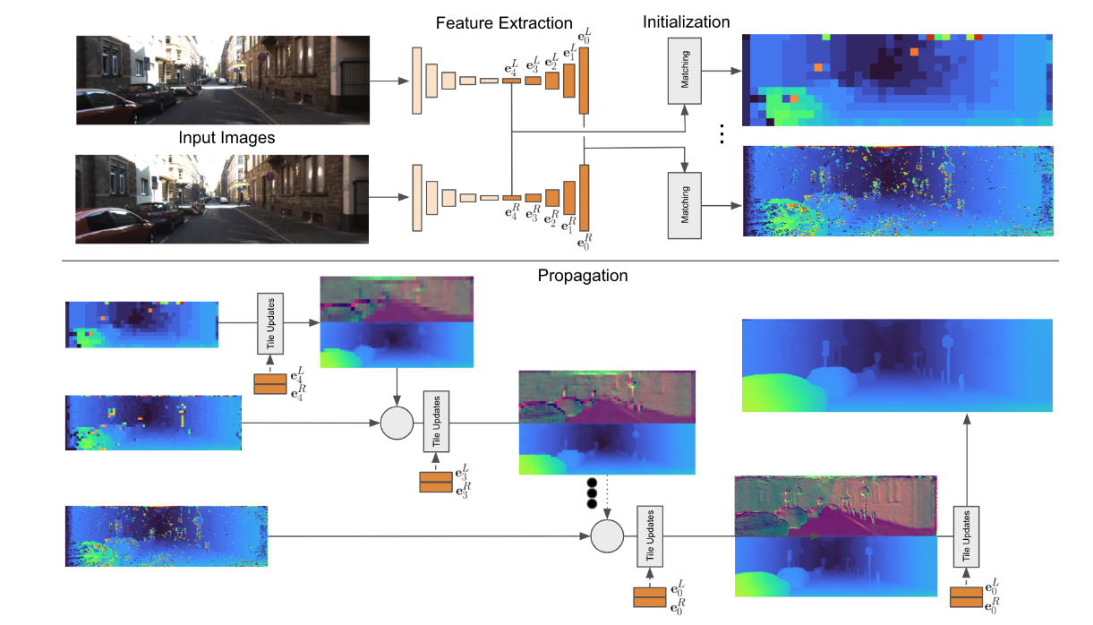 本文提出一种不需要构建代价体来进行立体匹配的方法,通过多分辨率初始化、可微的传播过程与warp机制来实现视差预测。此外基于倾斜窗口的假设来提升几何warp与上采样操作的精度;创新点如下: