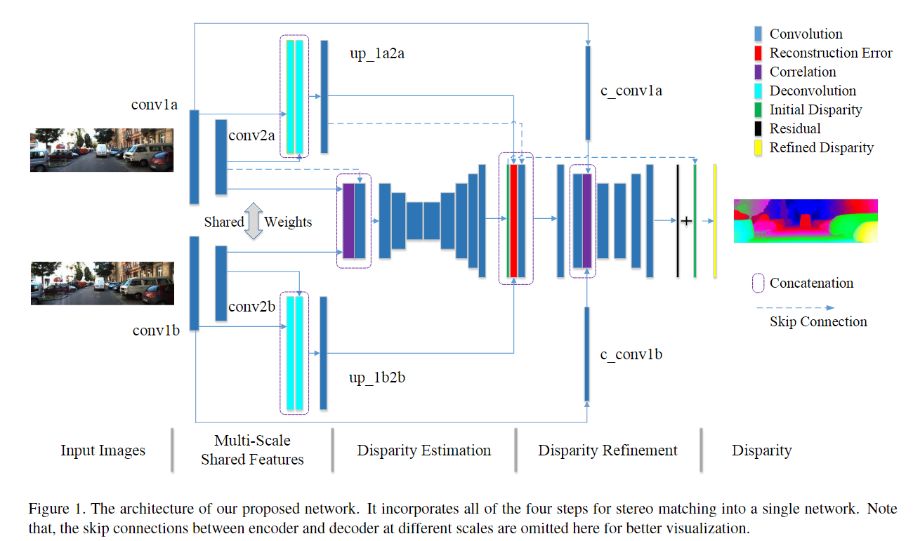 初始视差估计:视差估计网络借鉴了DispNetC,采用了encoder-decoder结构,采取跳跃连接。但不同于DispNetC,这里获得全分辨率的初始视差图。相关层连接左图特征,引入低级语义特征,有助于改进视差估计。