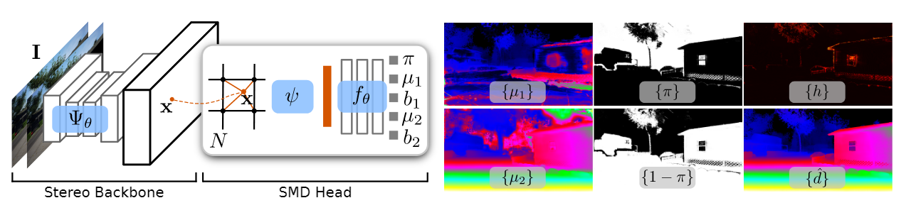 - 一种新颖的立体匹配学习框架,利用紧凑的参数化双峰混合密度作为输出表示,并可以使用简单的基于似然的损失函数进行训练。其简单的公式提升了深度不连续处的锐利表现,并提供了不确定性度。
