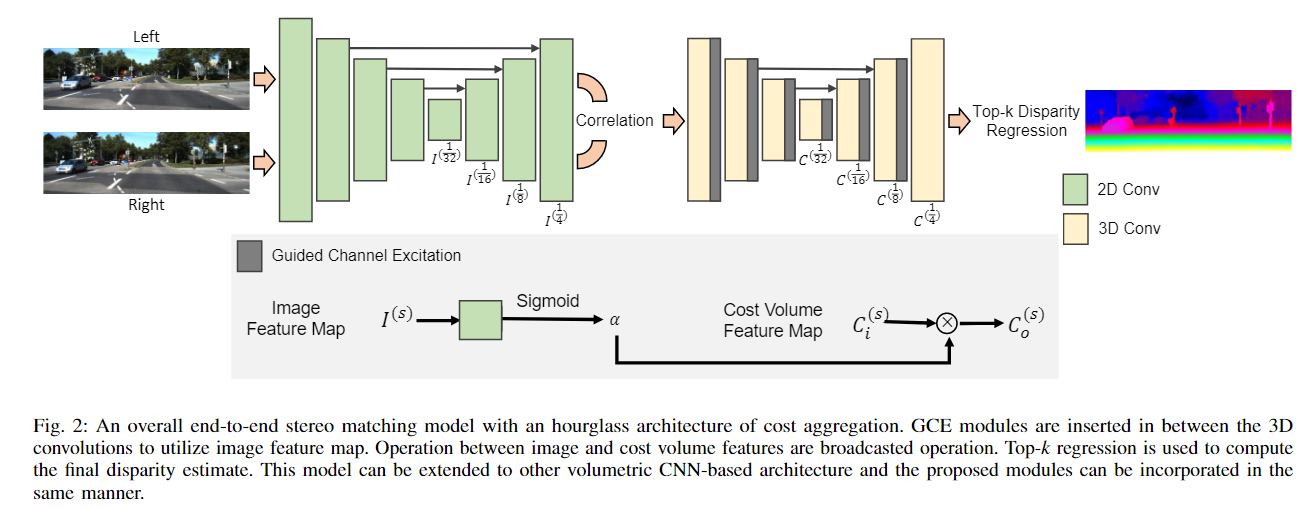 核心思想:提出了引导代价体激励(GCE),以利用从图像中提取的特征图作为代价聚合的指导来提高性能;提出了一种新的视差回归方法来代替soft-argmax(argmin)来计算前k个匹配代价值的视差,并表明它可靠地提高了性能;构建了一个实时立体匹配网络CoEx,它优于其他面向速度的方法,并与最先进的模型相比时显示出竞争力。