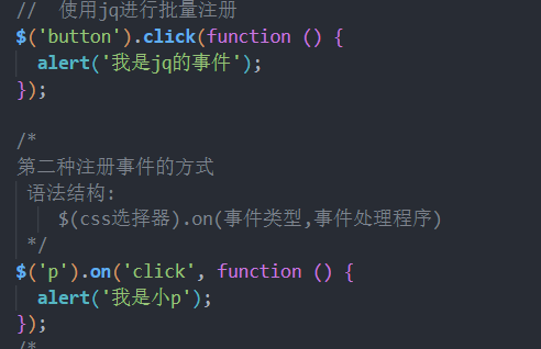 (1).第一个注册事件的方式是jq内部封装好的方法,但是并不是所有的事件都封装了,有一些新的事件就没有封装,比如说:tochstart(手指刚放在元素上触发)但是第二种注册事件支持