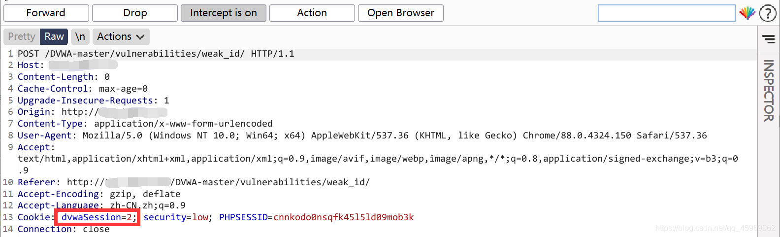dvwaSession的变化规律,使用BurpSuite抓包查看dvwaSession。 -